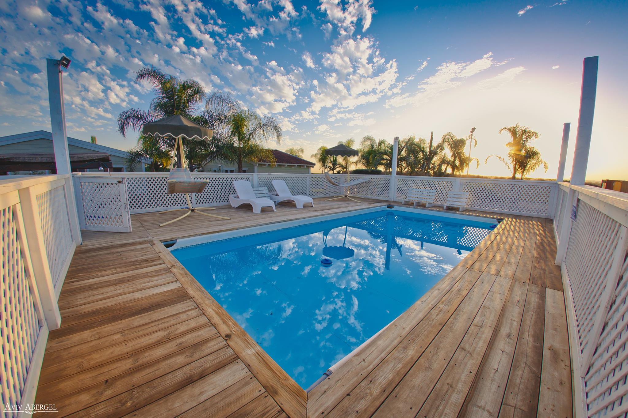 בחצר המתחם תמצאו מדשאה ירוקה ומרווחת עם דק עץ, ובריכה גדולה (לאורחי המתחם בלבד). בנוסף, כסאות שיזוף, שמשיות, וכל זאת אל מול הנוף המרהיב שממול. מתחם הצימרים הוא נקודת יציאה טובה לטיולים ואטרקציות משפחתיות באזור. נשמח להמליץ לכם על פעילויות מתאימות.